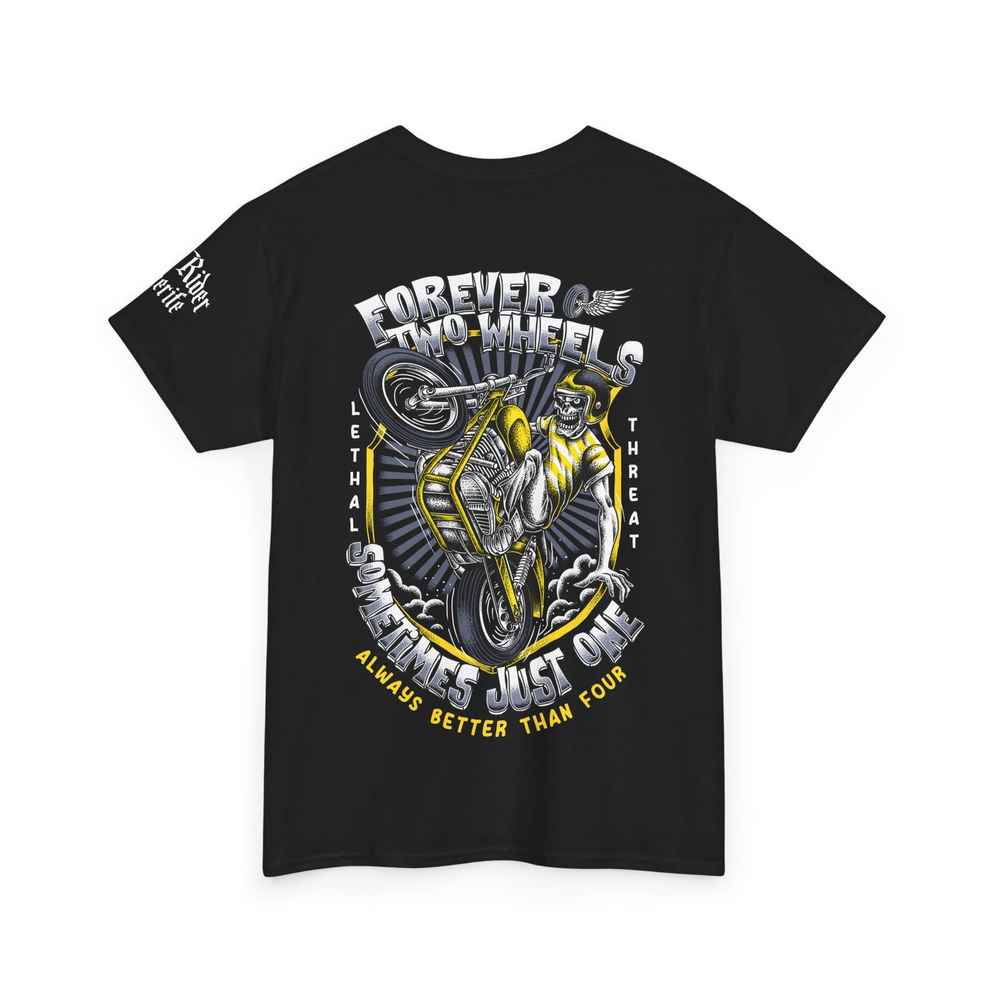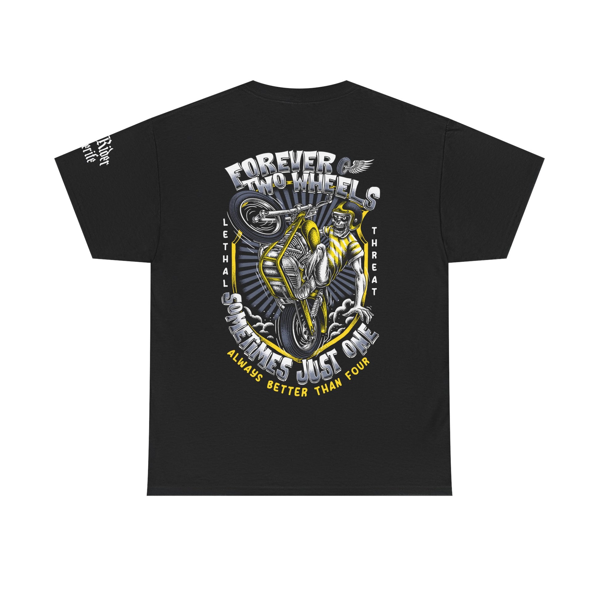 Ride or die—literally. Our new Forever Two Wheels t-shirt features a bold, old-school design of a skeleton biker throwing a mean wheelie on a classic chopper. It's a tribute to the wild ones, the freedom junkies, and anyone who knows that two wheels are all you really need.