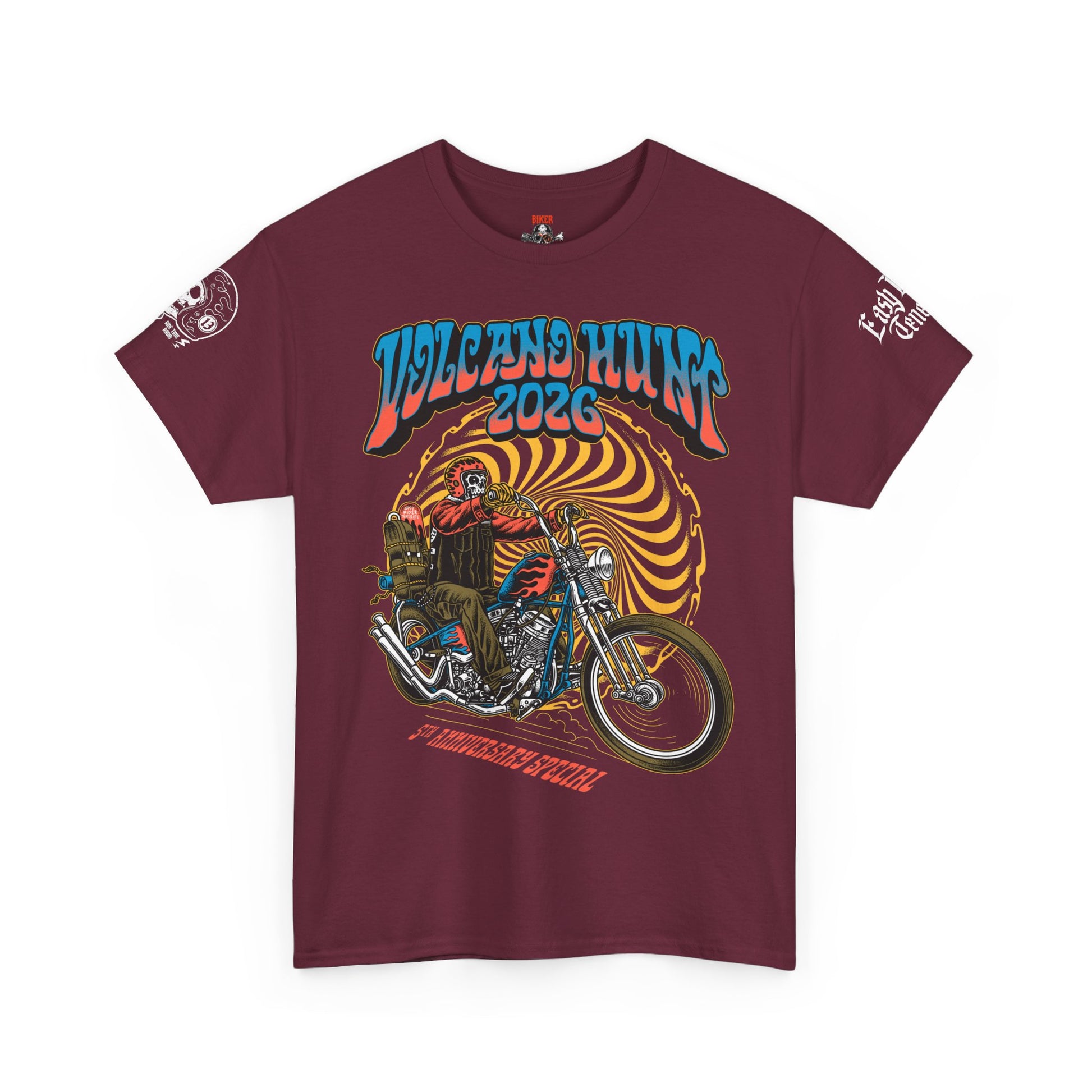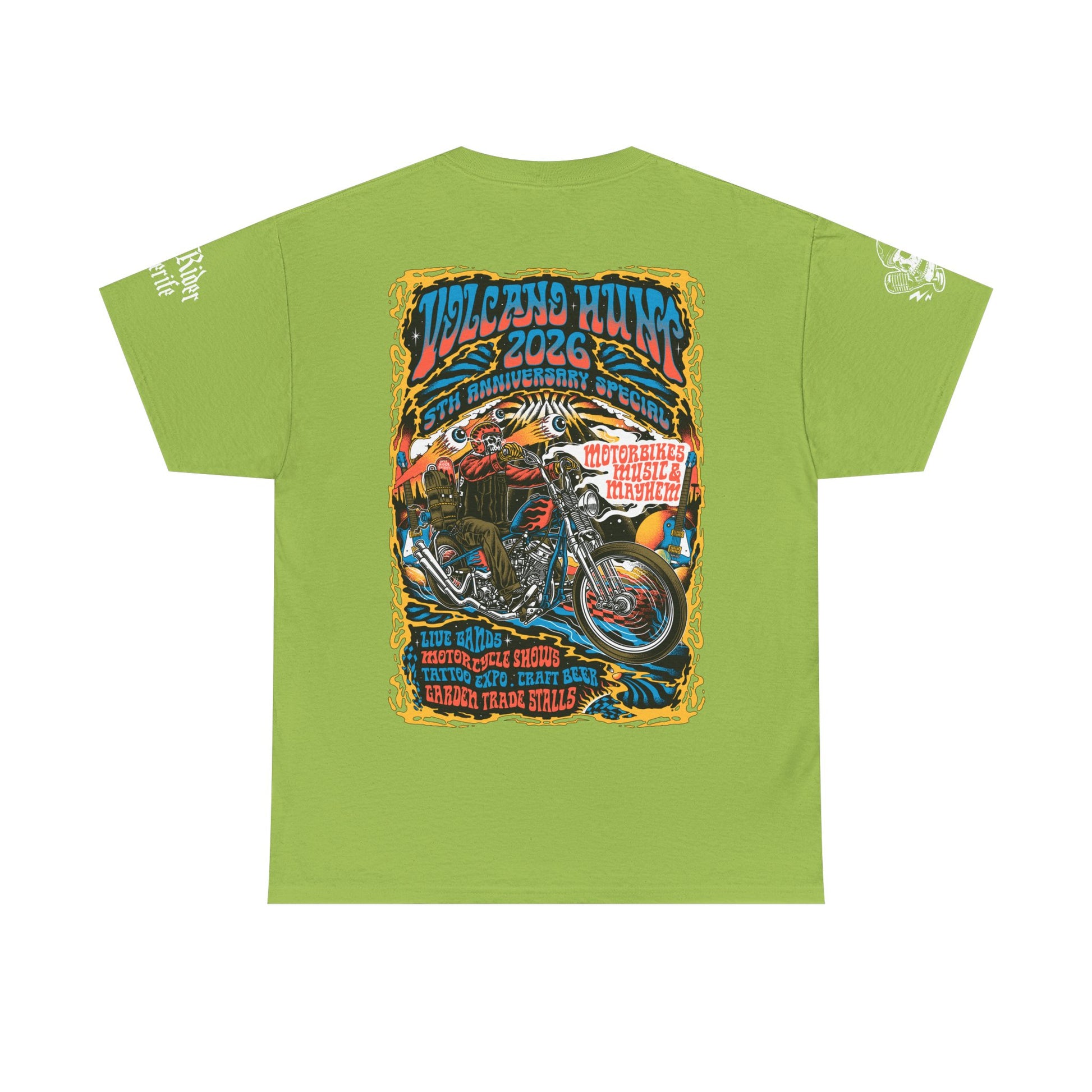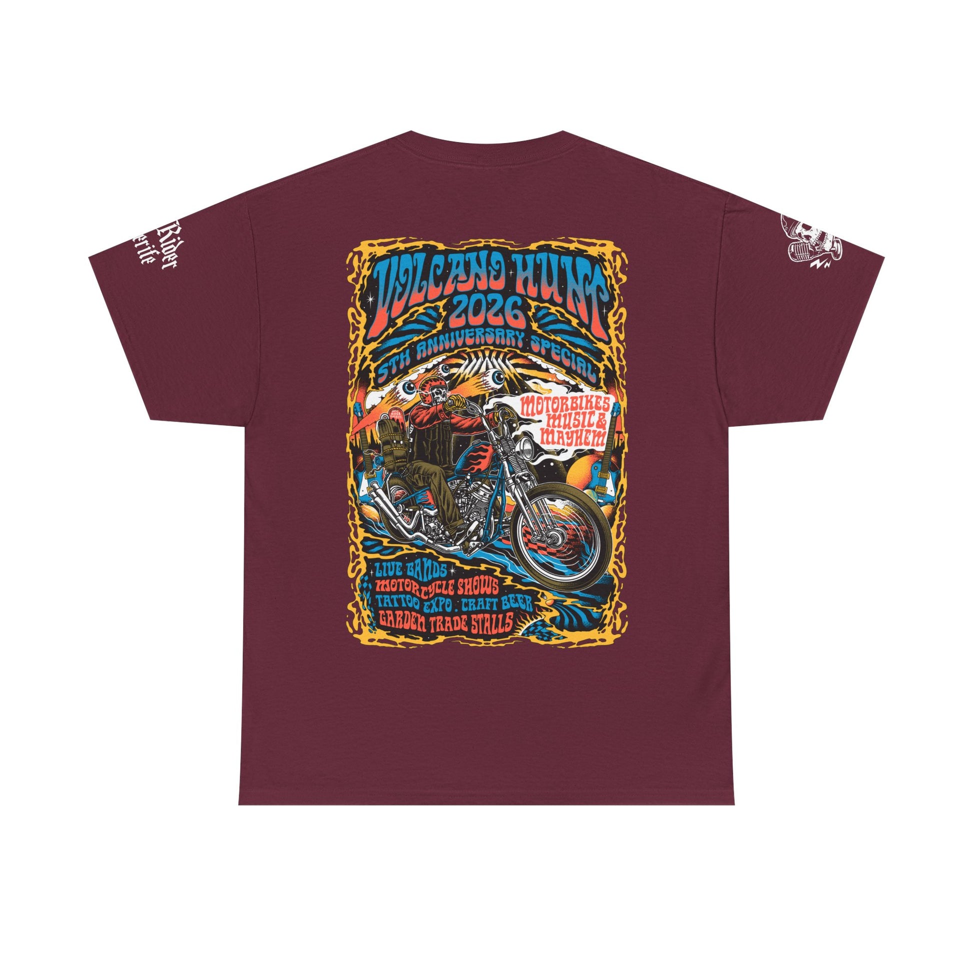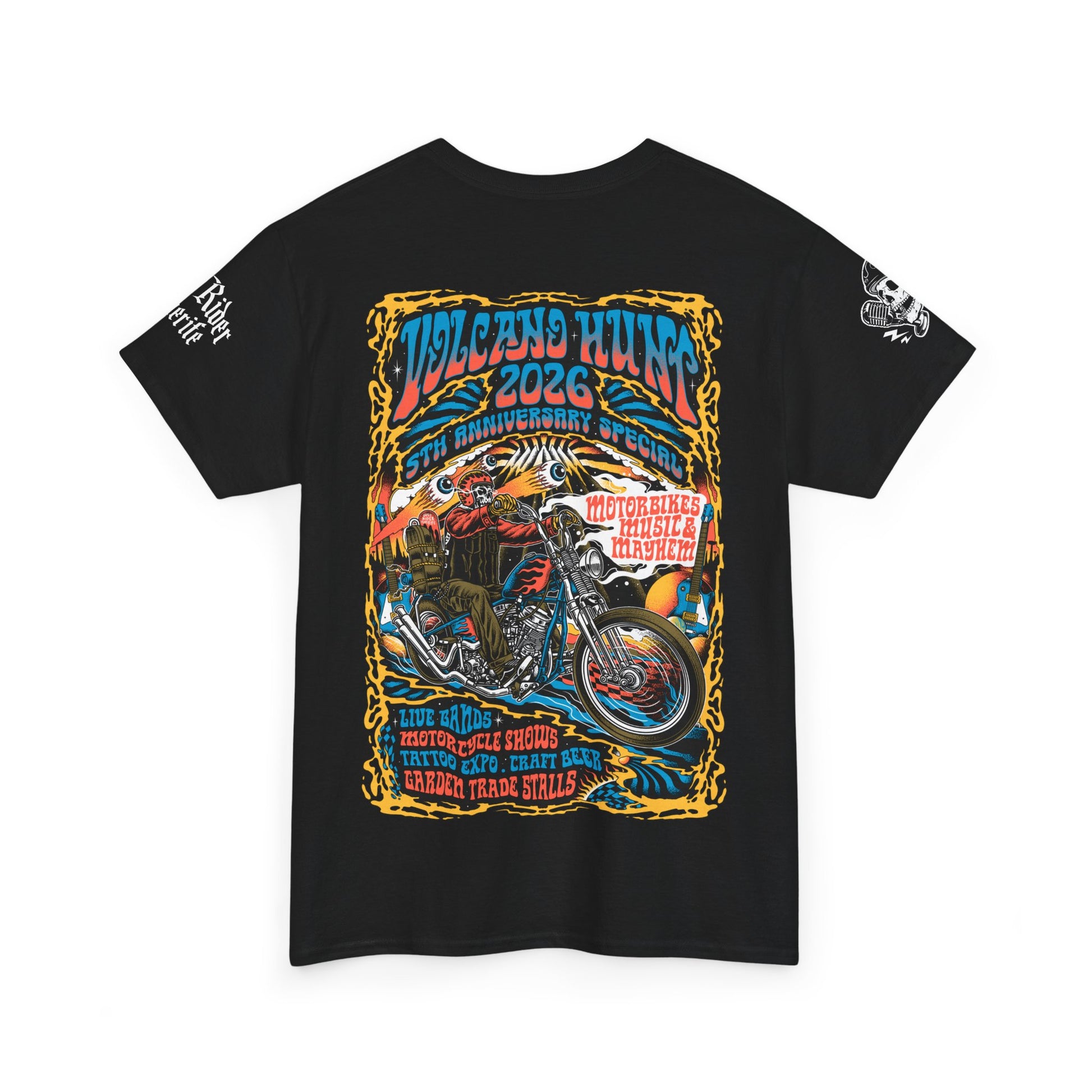 Created to celebrate the 5th Anniversary Volcano Hunt Festival, every shirt represents more than merch — it’s a badge of the tribe. From the roar of engines at sunrise to the music shaking the Duke Shops arena, this design captures the freedom, the fire, and the brotherhood that defines the Hunt.